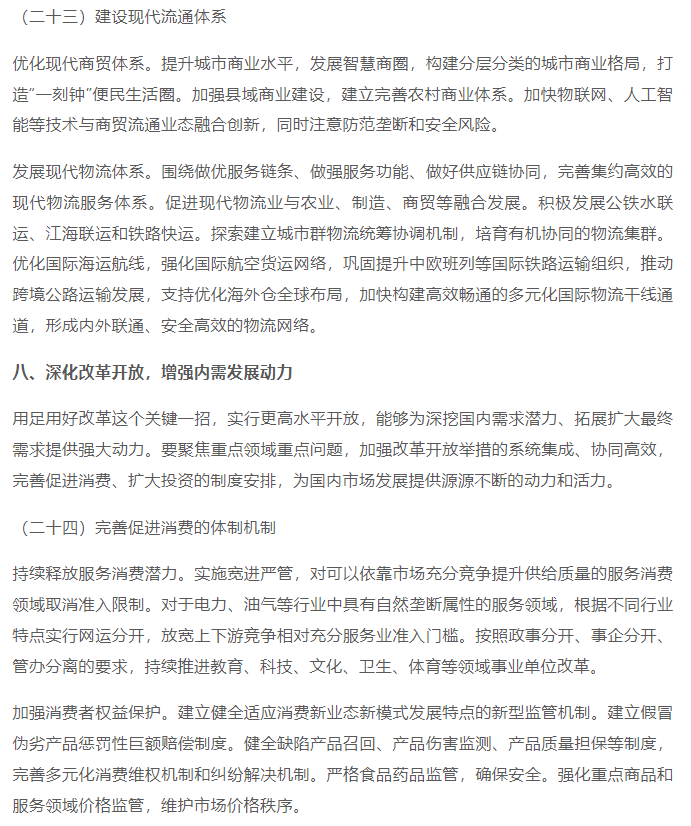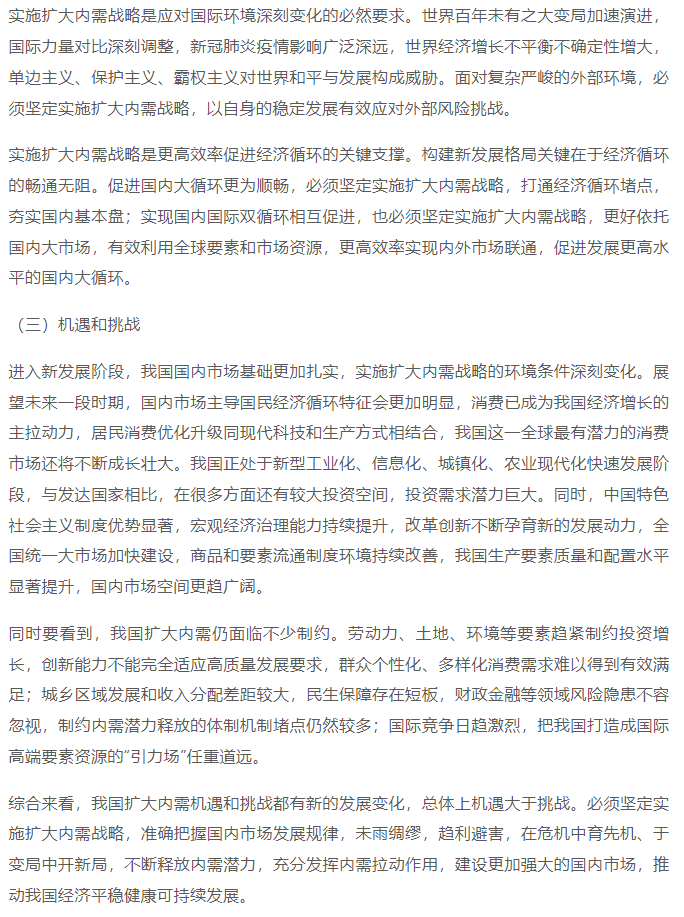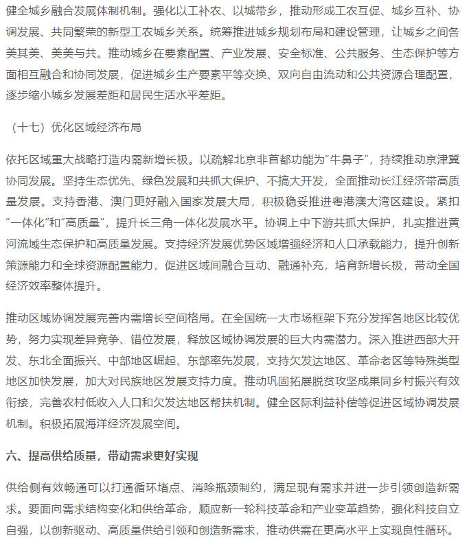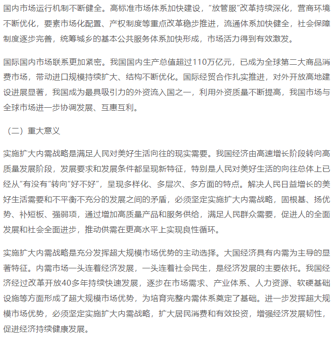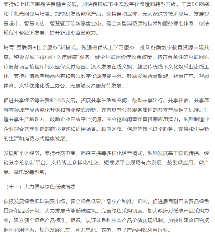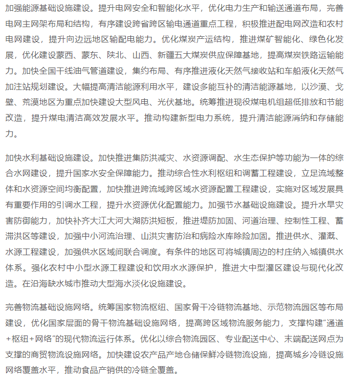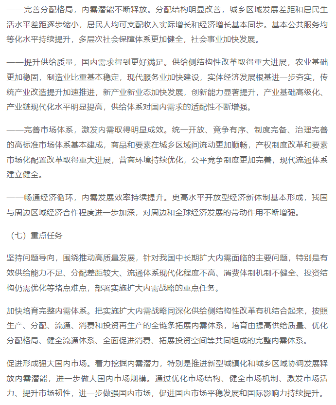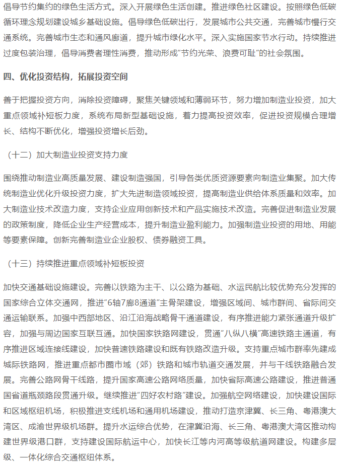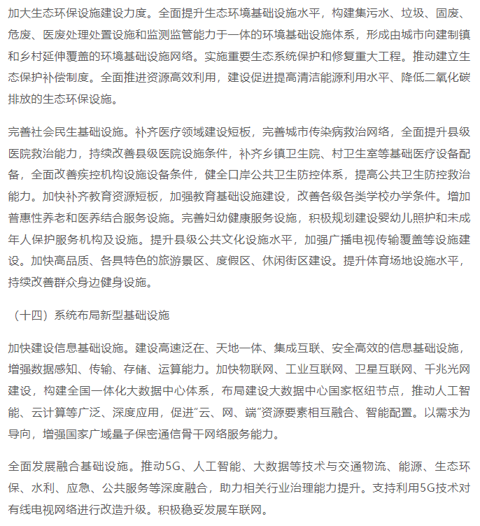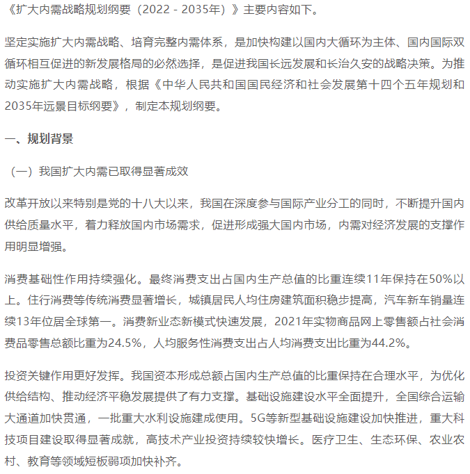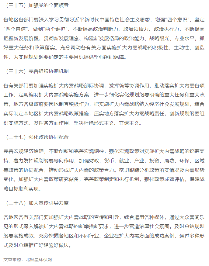 加大生态环保设施建设力度!中共中央、国务院印发《扩大内需战略规划纲要(2022-2035年)》近日,中共中央、国务院印发了《扩大内需战略规划纲要(2022-2035年)》,并发出通知,要求各地区各部门结合实际认真贯彻落实。其中提出加大生态环保设施建设力度。全面提升生态环境基础设施水平,构建集污水、垃圾、固废、危废、医废处理处置设施和监测监管能力于一体的环境基础设施体系,形成由城市向建制镇和乡村延伸覆盖的环境基础设施网络。实施重要生态系统保护和修复重大工程。推动建立生态保护补偿制度。全面推进资源高效利用,建设促进提高清洁能源利用水平、降低二氧化碳排放的生态环保设施。