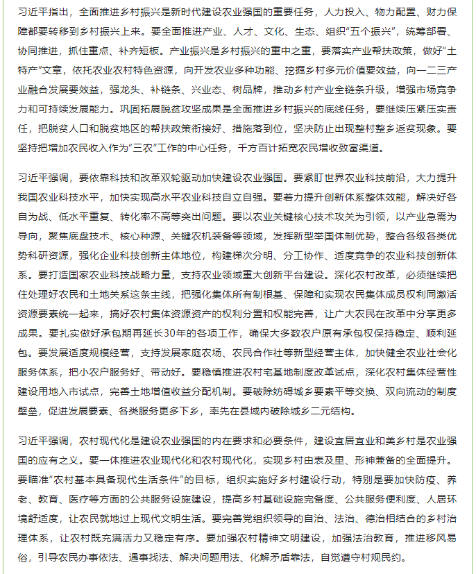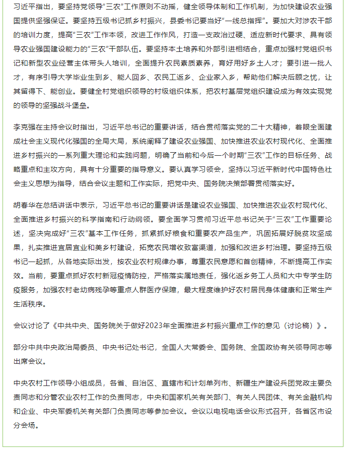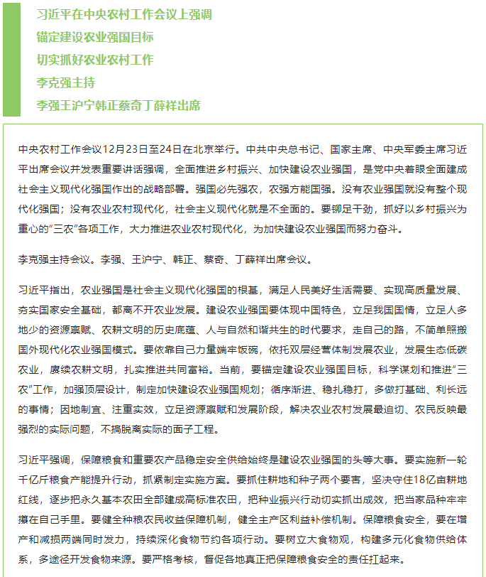 习近平在中央农村工作会议上强调 锚定建设农业强国目标 切实抓好农业农村工作